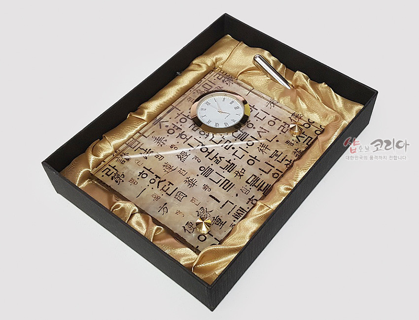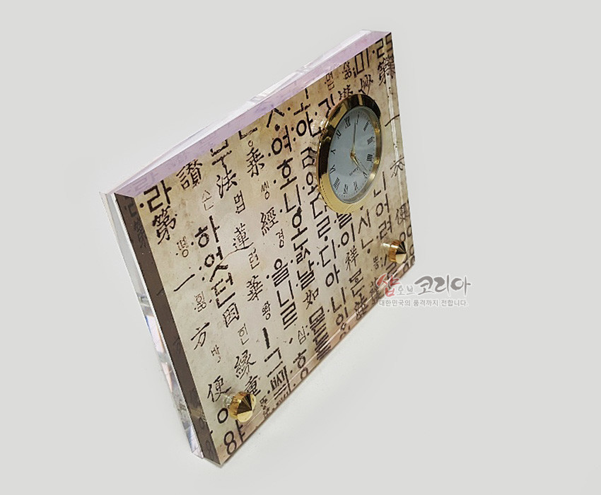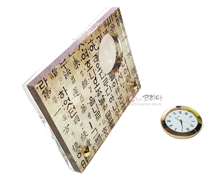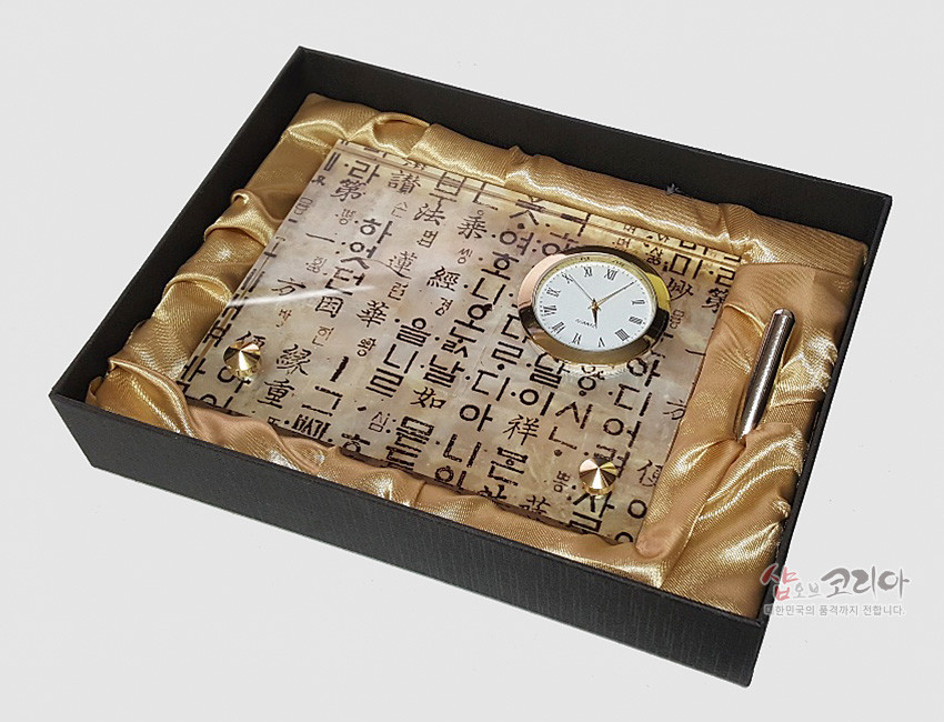 이 탁상시계는 천연 자개위에 한국 고유의 한지느낌과 훈민정음 문양을 인쇄하여 전통과 품격을 동시에 담고 있습니다.